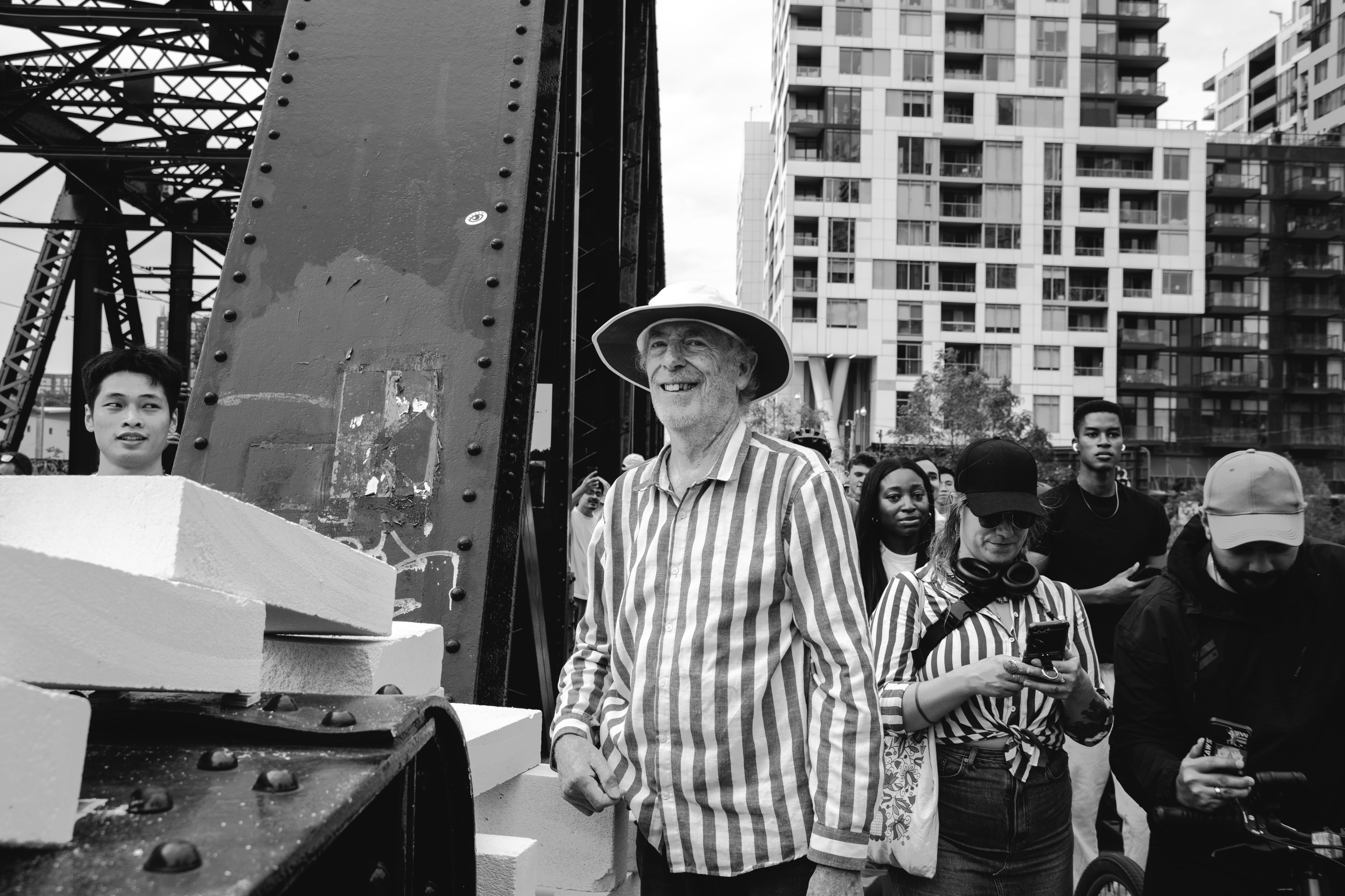 At one point, the dominoes would have stopped. There was what seemed like a four-domino space on the Bathurst Bridge. Some viewers were shocked. Julian Maynard Smith calmly stood and waited until the dominoes arrived to him, and pushed over the next piece. A smirk on his face led me to believe it was his design; art like life is about timing and intention.